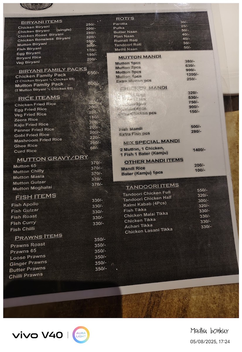 Many guests come here for lunch or dinner, enjoying dishes like Chicken Biryani and Mutton Mandi that bring warmth and depth in every bite. Starters such as Chicken 65 and a variety of prawn preparations offer light, flavorful beginnings, perfect for sharing with family or friends. These dishes harmonize well with the restaurant’s welcoming, unpretentious atmosphere, making each meal feel like a comfortable pause in the day.