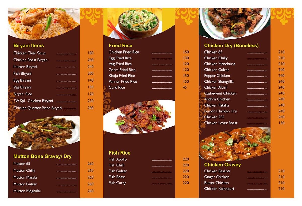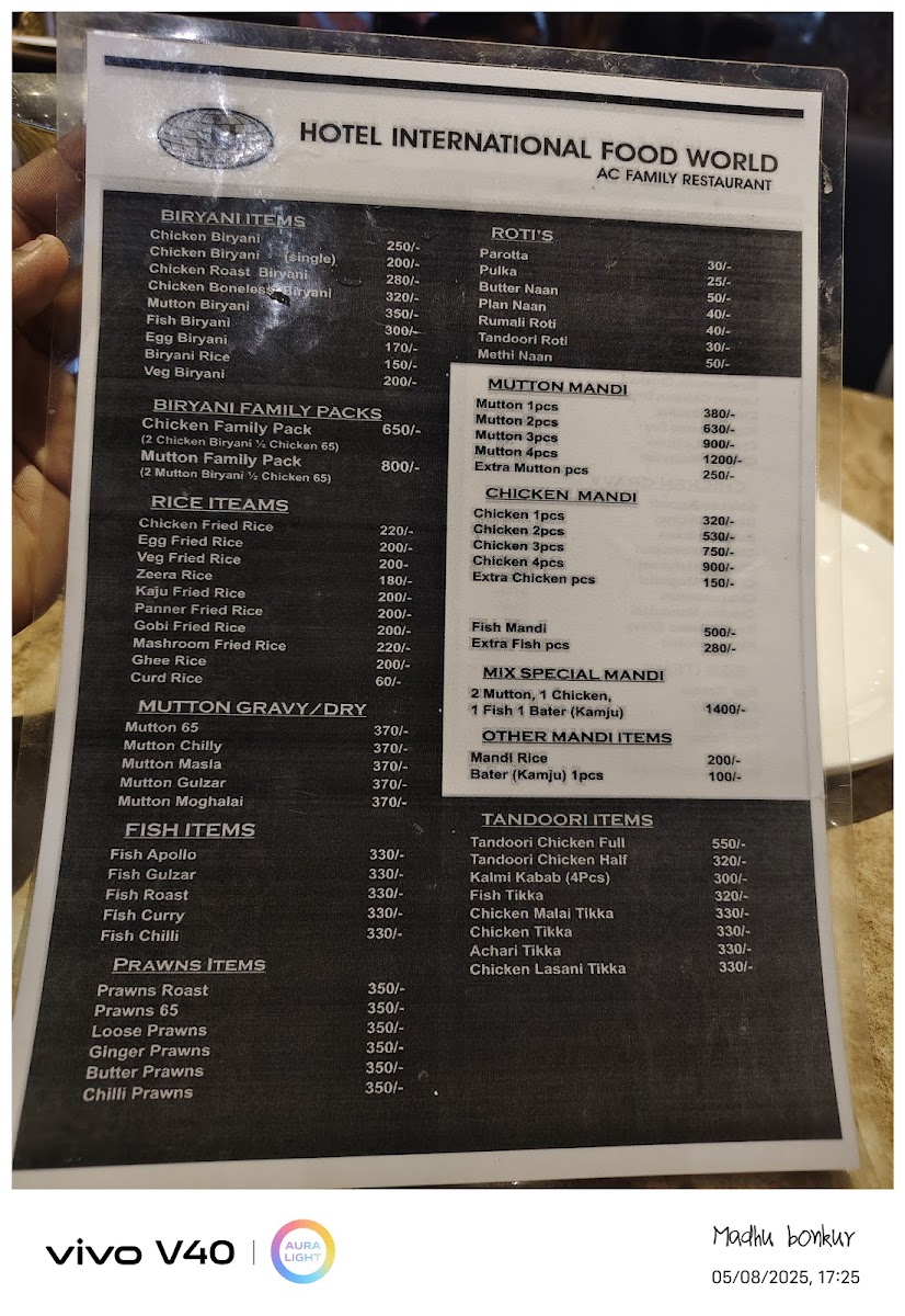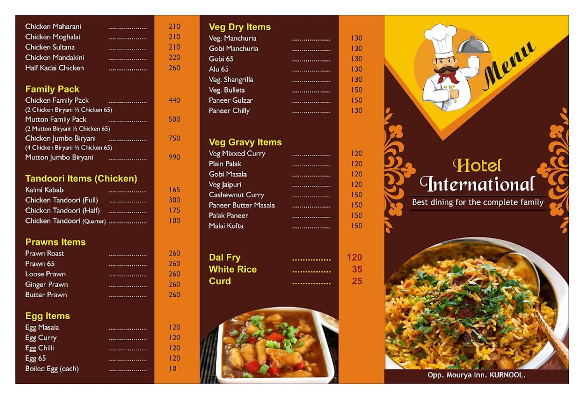 The menu at Hotel International Food World Kurnool embraces a balance of familiar Andhra flavors and hearty biryani specialties, offering a range of dishes that suit both casual meals and relaxed family gatherings. You’ll find a thoughtful selection that includes comforting biryanis, flavorful non-vegetarian mains, and satisfying vegetarian options, all presented in a straightforward, approachable way.